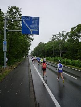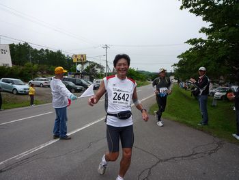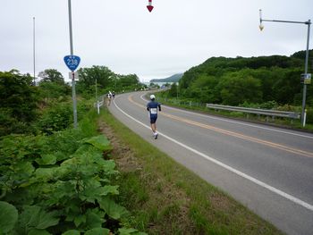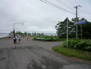 路面には大きな水溜りが残り、やはり走りにくい。でもゆっくり走っているので関係ないか・・・。今回はサロマのコースを十分に楽しんで走りたいので急ぐことは厳禁なのである。 |