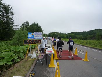 52.5k地点のエイド。23回目を迎えるだけあり、エイドの運営は最高レベルである。スタッフの皆さん全員が満面の笑みで出迎えてくれ、ドリンク等を配給してくれる。大変、気持ちのゆきとどいたサービスをしてくれる。感謝! |