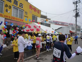 ここは名物の私設エイド「ストアー斉藤商店」。冷えたお絞りを渡してくれる。ひ〜っ!顔をぬぐうと気持ちいい〜!感謝! |