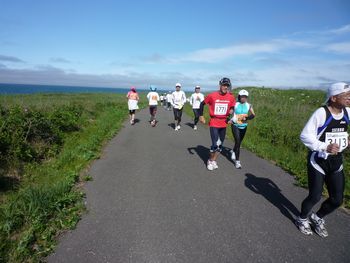 とはいえ、まったくスピードは出ない。ここは75k地点。5キロに実に40分以上かかりだす。ひどい走りだ。しかしナントカ走れる。もうすぐ原生花園であるが、こんな状態でなく痛みのないベストの状態で気持ちよく走りたかった。 |