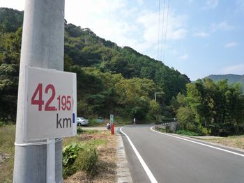 ![]() エイドをでるとスグ「42.195km」地点。4:23:28で通過した。 |
