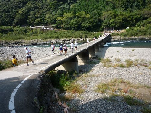 ![]() エイドを出ると、前方の眼下に橋が見えてきた。 |