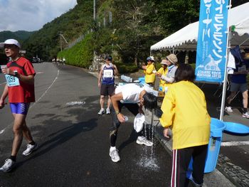![]() も〜暑い、暑い!各エイドごとに、このように冷たい氷水をかけてもらう。 |