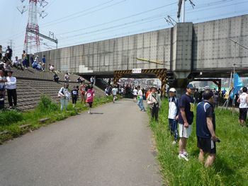 ![]() 襷渡し地点の土手の上に我がチームは陣取っている。 |