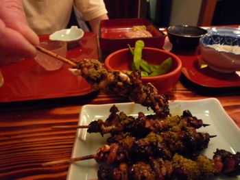 焼き鳥もおいしかったよ〜ん。ヒヒヒッ・・・、肉汁があふれ出ている。ネギが光ってるぞ〜!あまりに「ワサビ」が絶品だったので焼き鳥にも使用してみた。「ウフフフ・・・。」想像してみてください・・・。 |