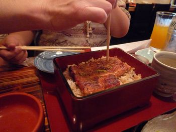 ここで達人の解説が入った。このお店の鰻のように本当に美味しい柔らかい鰻は、ご覧のように「割り箸」をまっすぐ上から刺してみると、ス〜ットと下まで何のつっかかりも無く入るのだそうです。10〜15分程度で出てくる鰻は、おそらく裂いて1度焼き、蒸した状況でキープ。注文が入った段階でタレをつけて焼く。キープしてからタレ焼きまで時間が長いと鰻皮が硬くなり、ハシが跳ね返されてしまそうです。試してみてくださいね! |