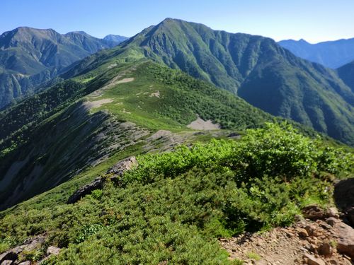山頂からは、聖から兎岳への痩せた稜線がハッキリと見えだした。つい先ほど、あの最低コルからの登り返しでバテてナカナカ進まず苦戦したところだ。
