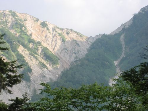 吊り橋の上から不動沢を望む。この山塊は大町市(長野)側が大きくガレており、信州側が大崩落した荒れた山々が連なっているのだ。