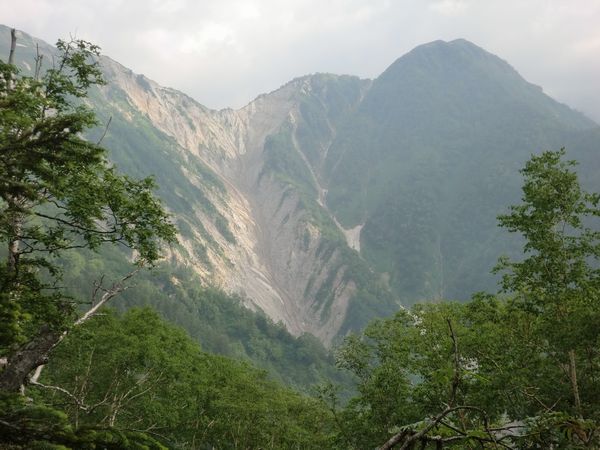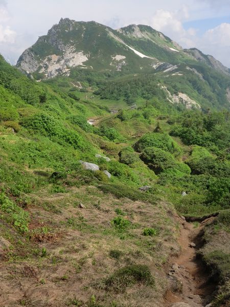 さらに下ると正面にごっつい岩場が迫ってくる。前方の雲をかぶっている大きな山が蓮華岳。左下にちらっと見えるコルが北葛乗越。乗越から蓮華岳山頂までは高度524mの大登り、北アルプスのトレイルではかなり大きなギャップである。下りは通称「蓮華の大下り」と呼ばれている。ここからの蓮華岳の眺めはカナリ迫力あるだろうなあ。