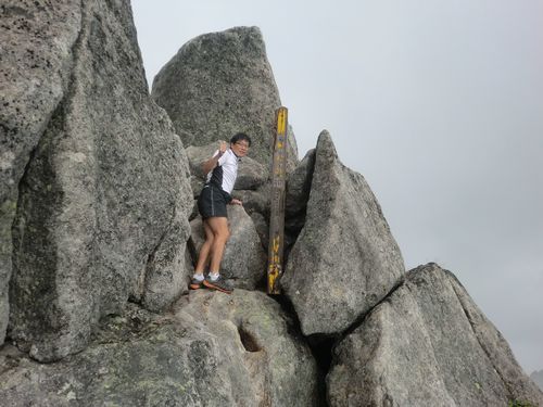 烏帽子岳(2628m)山頂、日本200名山である。岩にへばりつくようにして祝:初登頂!(笑)