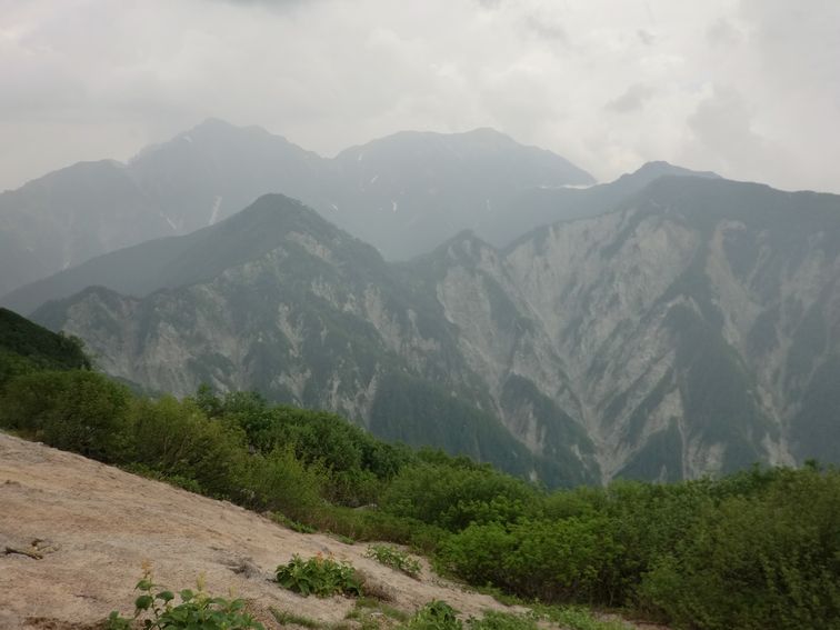 小屋から少し登ると、裏銀座の尾根の向こうに三ツ岳(2845m)。主稜線はガスッてみえない。