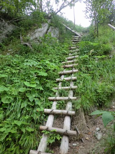 いきなり階段状の急な登りから始まり、スグに工事現場で使われているような足場で組まれた階段を登るようになる。
