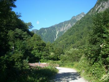 新穂高から蒲田川を渡り、左俣谷の林道を行く。思ってたより傾斜がきつい。時間短縮のため、ここは絶対に歩けない。前回の尾瀬と同じ感じだ。出だしでいきなり苦しいが、歯を食いしばって走る。 |