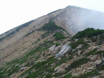 猛然と駆け下りだす。最初は右サイドが大きく崩壊し巨大なガレ場となっている。滑落に注意だ。突然ガスが上がり山頂を振り返る。もうあんなに遠くなった。 |