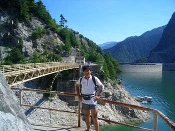 ダム手前の吊り橋前で。結構高度感のある吊り橋で、橋上では家族連れやカップルがこわごわ下を覗き込み、悲鳴を上げていた。この程度の高さが右に左にスパスパ切れ落ちたアスレティックコースを終えたユキチには、和やかな光景に映ったものである。 |