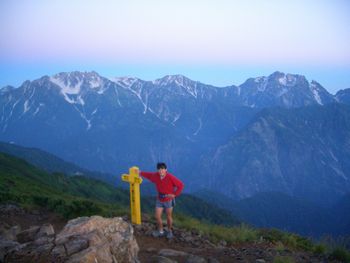 朝4:15分小屋を出発。満天の星空の中、ヘッドライトをつけて岩小屋沢岳を目指す。信州側からの風が強いが快晴である。約30分で2630Mの山頂に到着。もうかなり明るい。ここで朝飯の弁当を食べながら、御来光を待つことにした。朝日が当たる前に剣・立山連峰をバックに自分を入れて撮影しておいた。 |