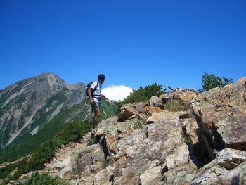 次に目指すは五竜岳山頂。あれなる山である。ここから標準コースタイムで6時間25の長丁場。う〜、闘志は湧くが身体が重い。(このときふと思った。五竜で下りようかな〜って・・・。) |