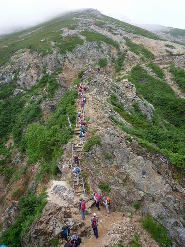 ![]() 合戦小屋まで荷を引き上げるリフトの軌道が、登山道を横切っている。 |