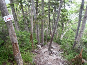 | 標高が記入された道標に導かれて下るが、豪快に下っている割には高度が落ちないのでイライラする。もう、勘弁してくれ!っというくらい段差が激しい嫌な下り。 |