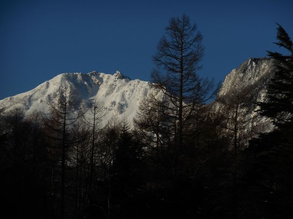 朝日に輝く天狗岳東峰(2646m)と稲子岳南壁。