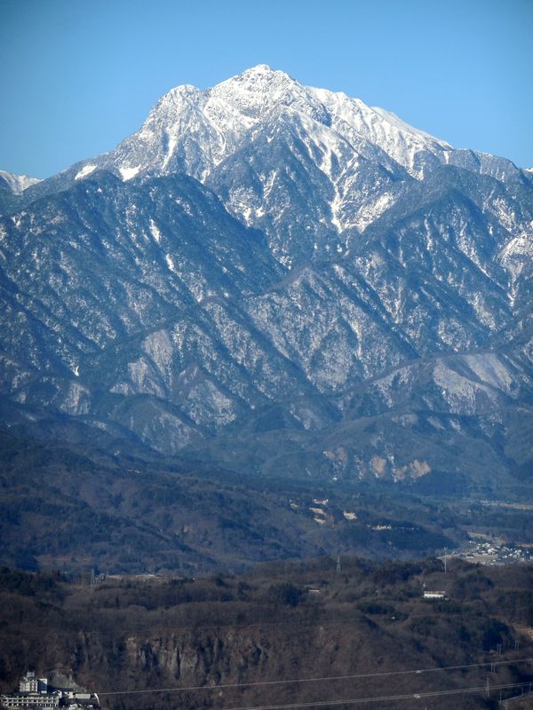 そして圧巻は甲斐駒ヶ岳(2967m)。釜無川の底から高度差約2400mをせり上がるピラミダルな姿は息をのむ絶景。この豪快で美しい山体はここから見るのが最高だ。ちょうど頂上直下の赤石沢の奥壁の大岩壁が真正面に見え、その左手には摩利支天峰。甲斐駒の峻烈さが際立つ角度なのである。奥壁のダイヤモンドフランケA赤蜘蛛ルートは有名だ。