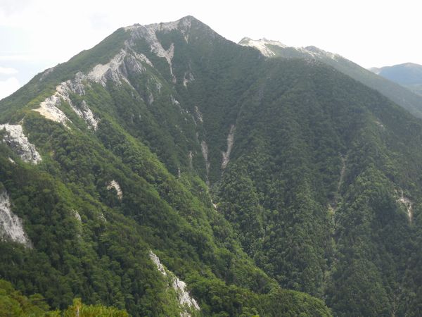 花崗岩が露出した白い頂の中で緑にほぼ覆われたい頂を持つ高嶺、直下に入った。