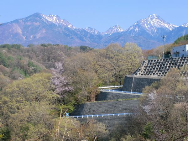 ダムを渡り対岸にでると、ダムの全容と八ヶ岳連峰の展望が広がる。