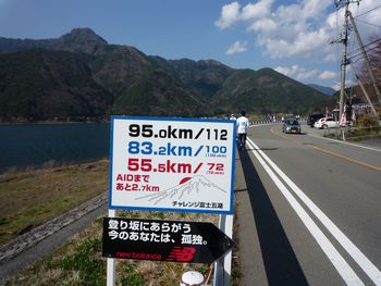 富士山をバックに河口湖大橋を渡る!ここはコースのハイライトである。