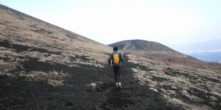 フカフカの火山灰土のトレイルをゆく。このあたりがこのコースのハイライトだな。