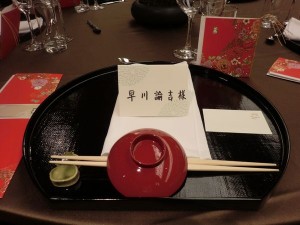 始まった~。数々のおいしい老舗料亭料理につられ、ビール、ワイン、冷酒、燗酒と次から次へと杯が進む。
