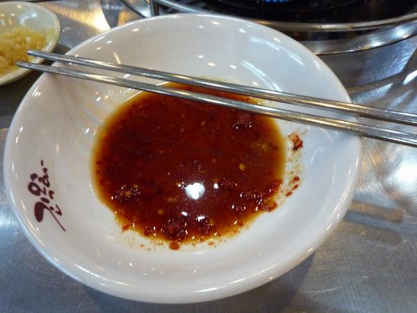 トウガラシペースト、酢、しょうゆ、カラシで作ったこのお店秘伝のタレが登場!鉄のお箸で食べるのが韓国流。
